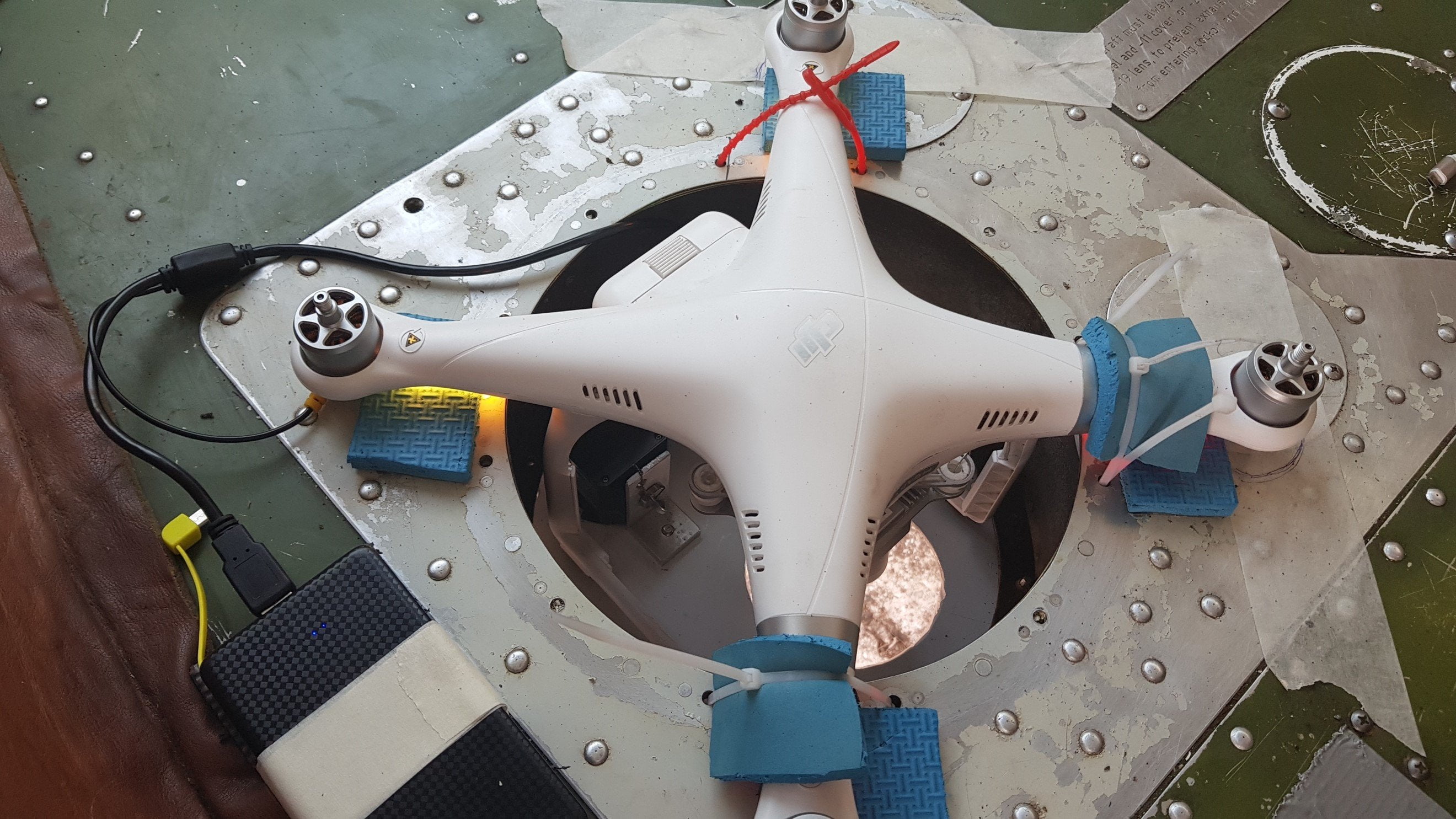 Следниот проблем кој требаше да го решиме е немањето на ГПС во термалната камера, што го отежнуваше спојување на термалните слики. За креирање на визуелната RGB мапа, единствената камера со ГПС која ја имавме беше камерата која е монтирана на дронот DJI Phantom 3, при што самиот ГПС уред е сместен во дронот, а не во камерата. Согласно ова дојдовме до идеја да го монтираме целиот дрон во авионот и на тој начин да го направиме визуелното снимање на градот со камера која ќе ја тагира секоја слика со GPS координати.